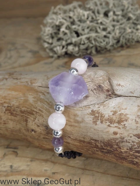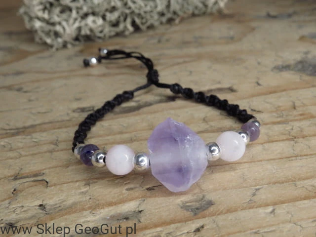 ametyst i kwarc różowy * bransoletka makrama /Ag