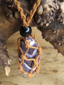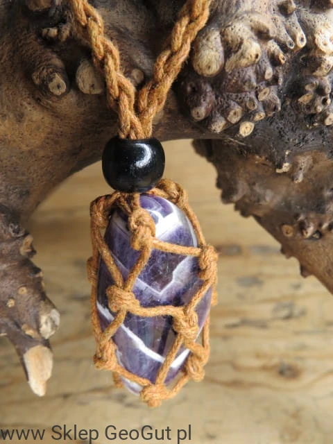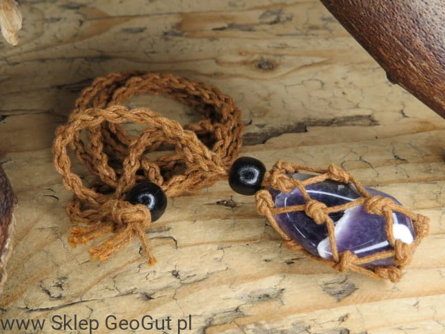 Naszyjnik z ametystu w eleganckim koszyczku z plecionych brązowych sznurków. Drewniane koraliki umożliwiają regulację długości do 74 cm oraz wyjęcie kamienia, którego wymiary wynoszą 4 x 2,2 x 1,2 cm. Naszyjnik doskonale pasuje do stylizacji boho, etno, hippie oraz naturalnych i casualowych zestawów. To wyjątkowy dodatek dla osób ceniących rękodzieło, bliskość natury i unikatowe formy biżuterii.