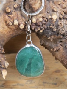 Brelok z awenturynu zielonego oprawionego w miedź i cynę.