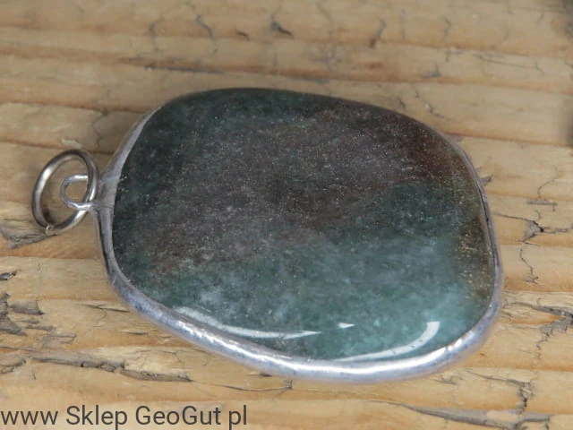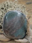 Wisior z awenturynu zielonego oprawionego w miedź i cynę.