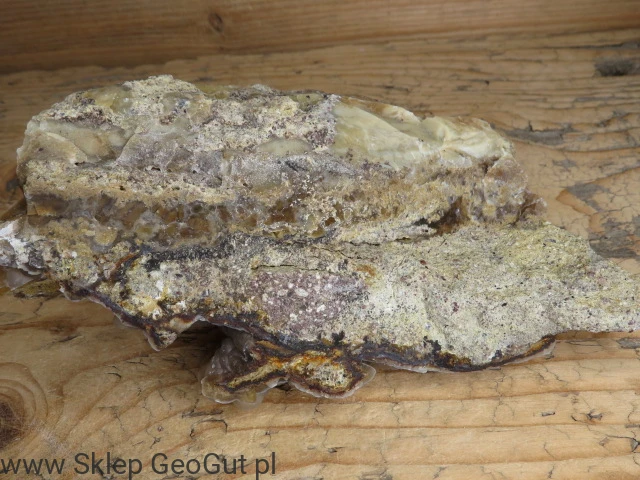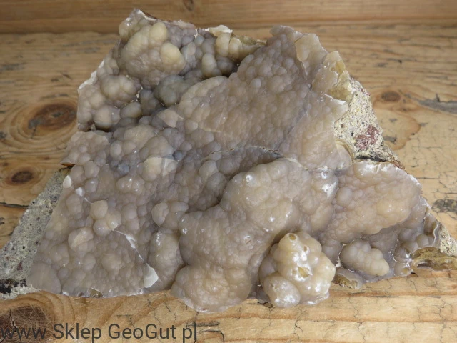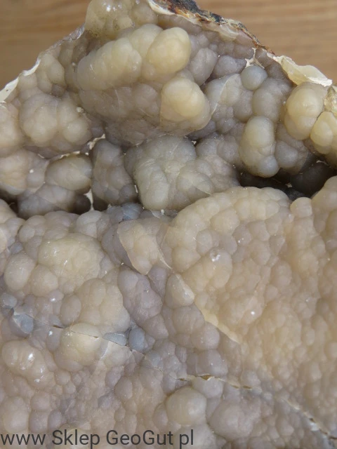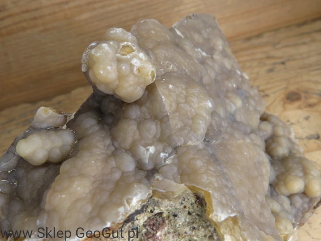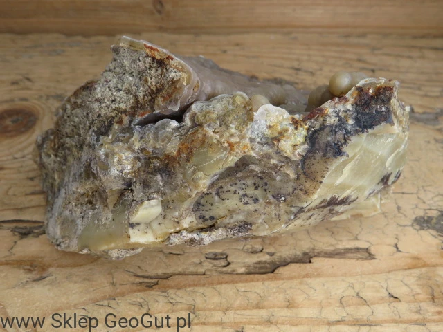 Chalcedon i opal z Jawy to naturalny okaz minerału kolekcjonerskiego o wyjątkowym wyglądzie i charakterystycznych groniastych strukturach. Dodatkową cechą okazu jest fluorescencja chalcedonu, widoczna w świetle UV o długości fali 365 nm UV-A, co czyni go jeszcze bardziej interesującym elementem kolekcji.