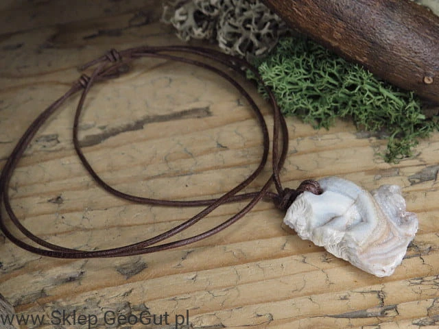 Chalcedon, jako kamień harmonii i równowagi, ma swoje miejsce zarówno w biżuterii, jak i w duchowych praktykach. Ten amulet zawieszony jest na brązowym, skórzanym rzemyku, którego długość możesz regulować dzięki praktycznym supełkom. To idealna opcja dla osób ceniących unikatowe, ręcznie wykonane dodatki, które łączą estetykę z naturalnym pięknem kamieni.