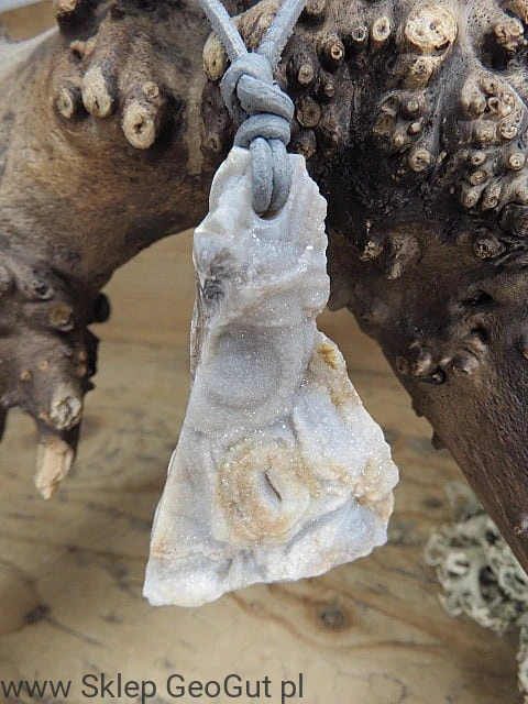 Chalcedon, jako kamień harmonii i równowagi, ma swoje miejsce zarówno w biżuterii, jak i w duchowych praktykach. Ten amulet zawieszony jest na szarym, skórzanym rzemyku, którego długość możesz regulować dzięki praktycznym supełkom. To idealna opcja dla osób ceniących unikatowe, ręcznie wykonane dodatki, które łączą estetykę z naturalnym pięknem kamieni.
