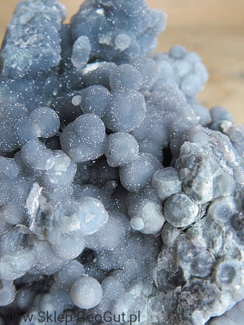 Chalcedon winogronowy pokryty drobnymi, błyszczącymi kryształkami kwarcu.
