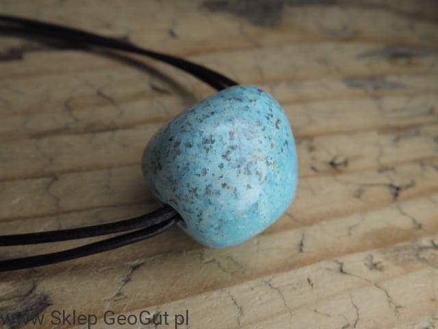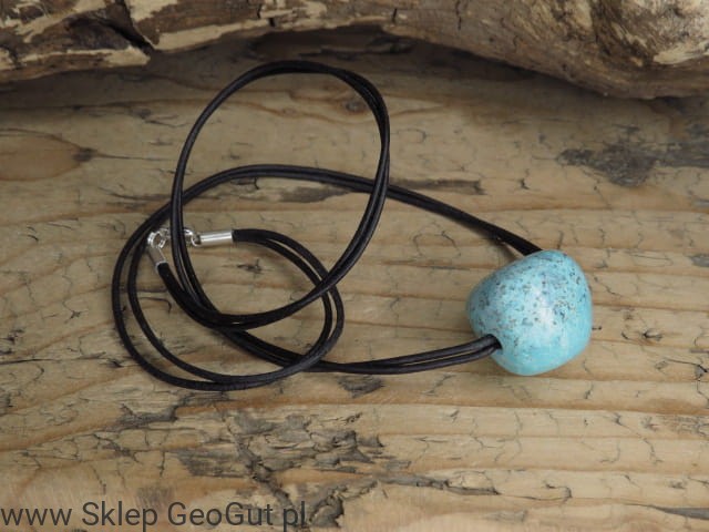 Kamień przewiercony i zawieszony na podwójnym rzemieniu w kolorze czarnym. Rzemień o długości 54cm ze srebrnym zapięciem Ag 925.
