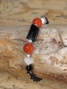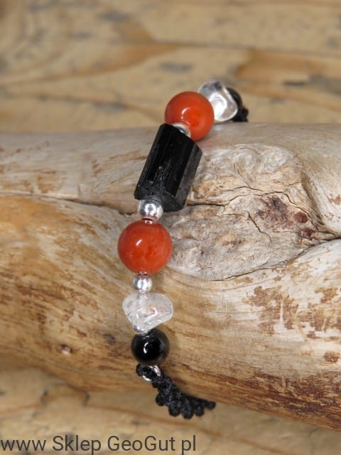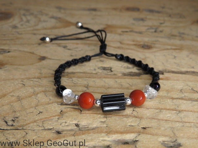 Bransoleta z kamieni ochronnych: czarny turmalin, kryształ górski, jaspis czerwony. Są to kamienie o silnych właściwościach ochronnych, odbijające złe życzenia, chroniące przed negatywnym spojrzeniem i negatywnymi wibracjami.