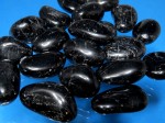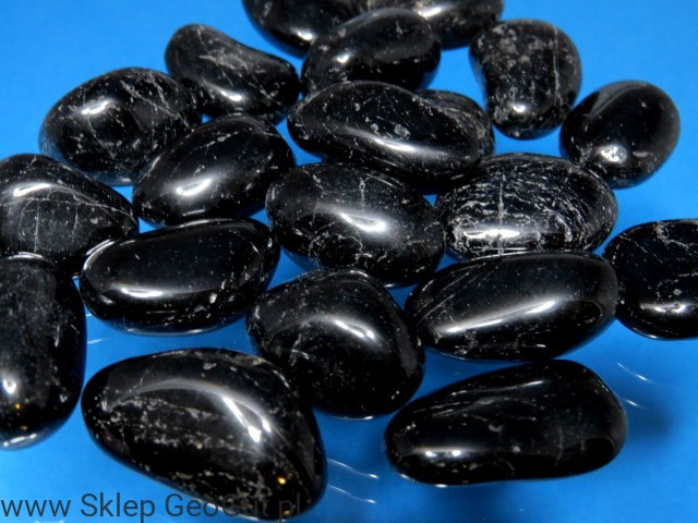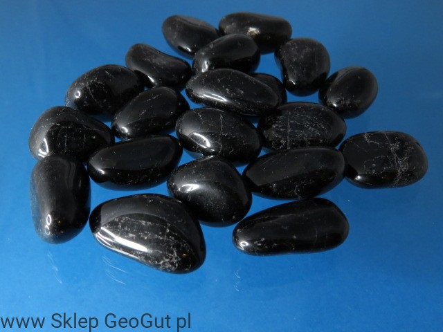 Czarny turmalin (szerl)- wypolerowany bębniak. Kamienie posiadają liczne spękania wynikające ze struktury kamienia.