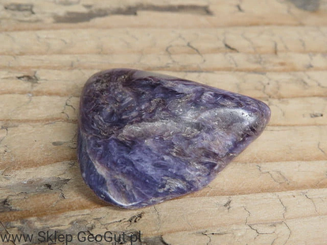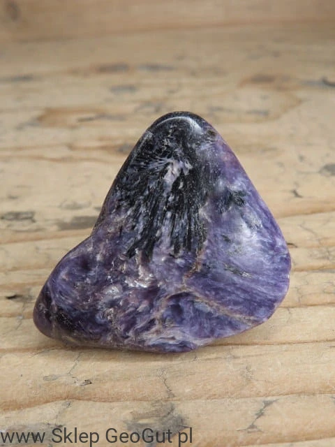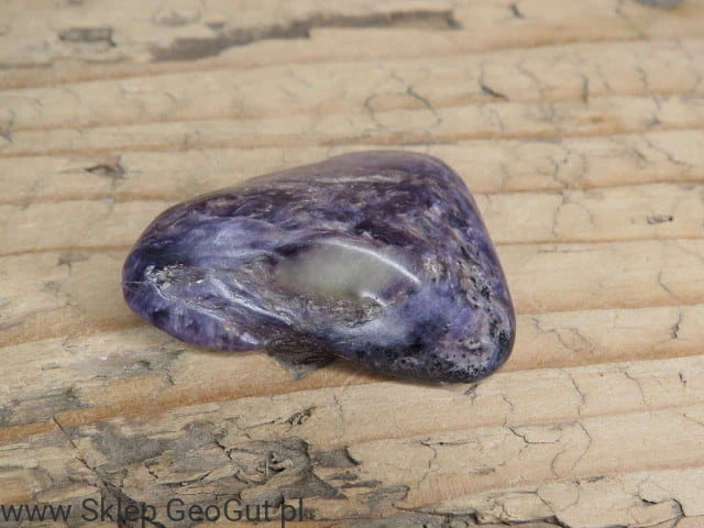 Czaroit - bębniak - okaz wypolerowany, posiada maleńkie zagłębienia i spękania. Do okazu dołączona metryczka.