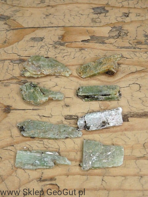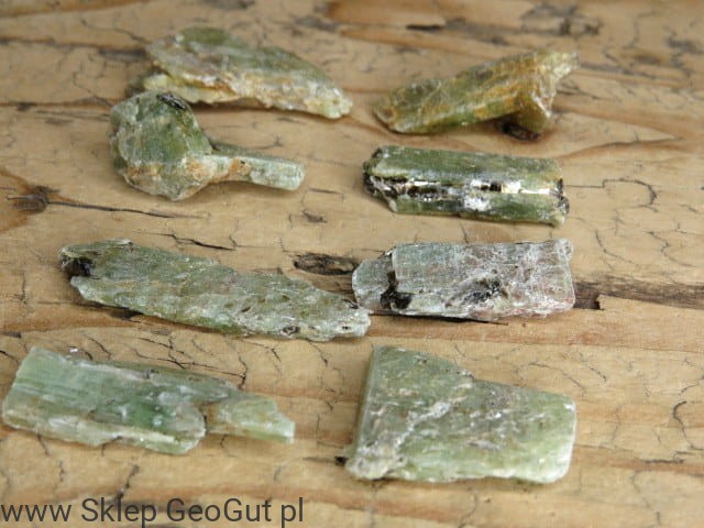 Dysten (cyanit, kyanit, cyjanit) – naturalny minerał z gromady krzemianów glinu. Prezentowane małe okazy wyróżniają się zielonym odcieniem i unikatową strukturą kryształów. Idealny dla kolekcjonerów minerałów, pasjonatów geologii oraz do celów edukacyjnych.