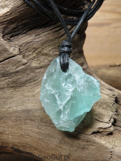 Ten wyjątkowy wisior wykonany jest z zielonego fluorytu w całkowicie surowej formie, przewiercony w szlifierni GeoGut. Surowy kamień zachowuje naturalną strukturę i kształt, dzięki czemu jest niepowtarzalny. Zawieszony na czarnym, skórzanym rzemyku tworzy prosty, a jednocześnie energetyczny talizman.