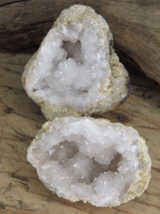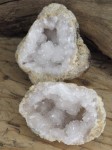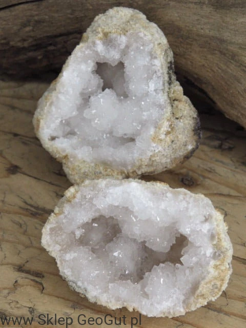Otwarta geoda (dwie połówki) wypełniona błyszczącymi kryształami kwarcu.