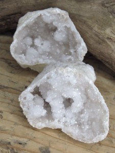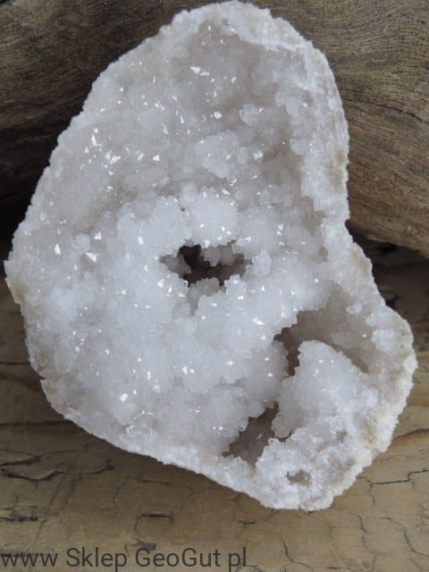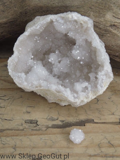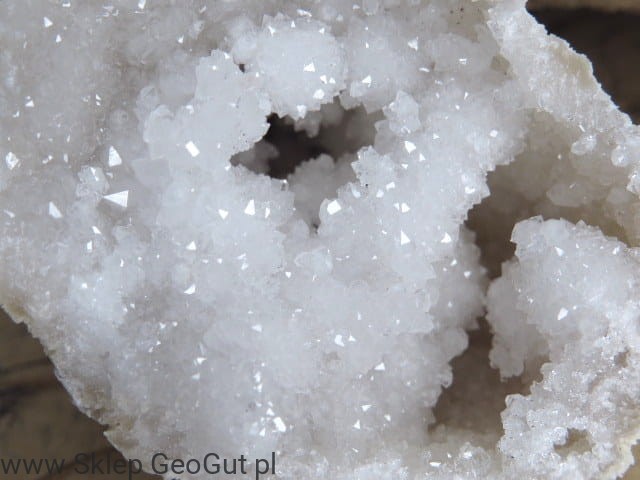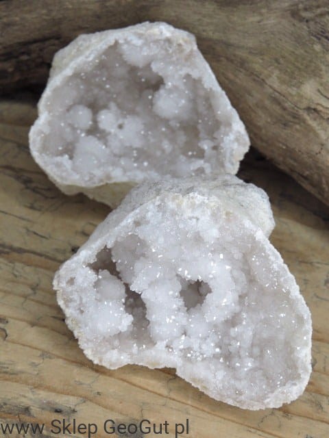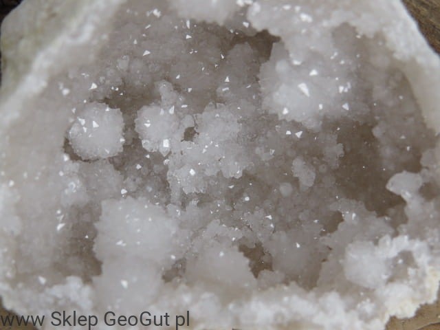 Otwarta geoda (dwie połówki) wypełniona błyszczącymi kryształami kwarcu. Wewnątrz geody znajdują się "serca geody" - kuliste szczotki kryształu górskiego. Te unikatowe naturalne formy powstają wewnątrz geody kwarcowej.