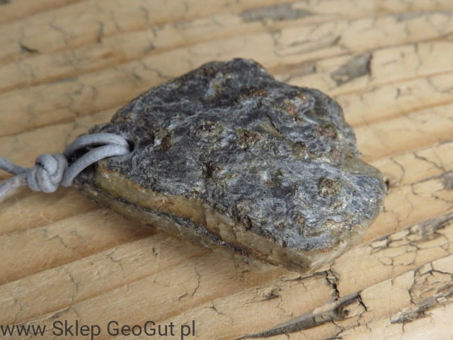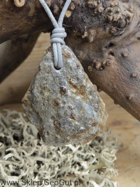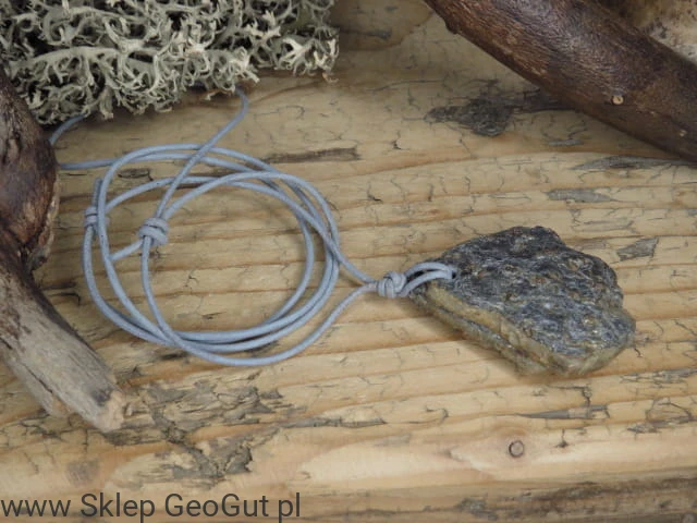Wisior z granatów w łupku łyszczykowym z Polski (Góra Siniak, Kąty Bystrzyckie koło Lądka - Zdroju), starannie przewiercony i zawieszony na stylowym, szarym rzemieniu. Długość rzemyka można swobodnie regulować za pomocą przesuwanych supełków, co pozwala na dopasowanie długości do własnych preferencji.