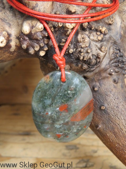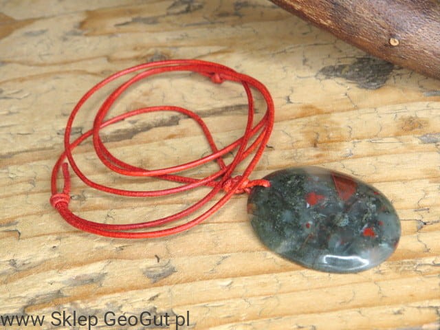 Wisior z heliotropu na czerwonym rzemyku to amulet wykonany z naturalnego kamienia o owalnym kształcie. Heliotrop, znany również jako krwawnik lub bloodstone, jest kamieniem odwagi, siły i ochrony. Uważany za talizman wojowników – dodaje energii, wspiera w pokonywaniu trudności i wzmacnia wytrwałość. Pomaga zachować spokój w stresujących sytuacjach oraz wzmacnia odporność organizmu.