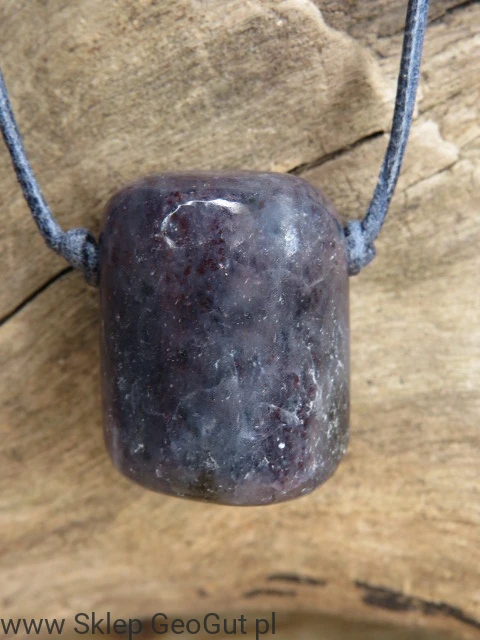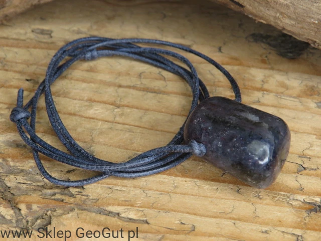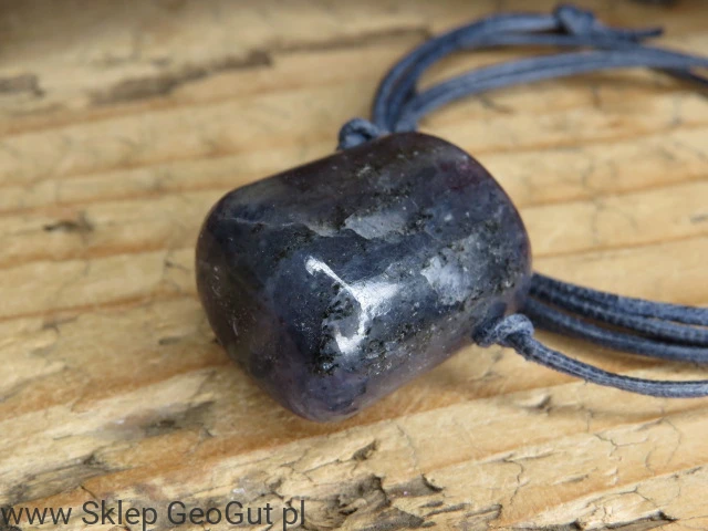 Magiczny talizman wykonany z naturalnego iolitu – kamienia o granatowo-fioletowej barwie i wyjątkowej aurze. Kamień został przewiercony i zawieszony na granatowym, skórzanym rzemieniu. Długość rzemyka regulowana za pomocą przeciąganych supełków.