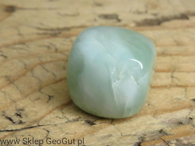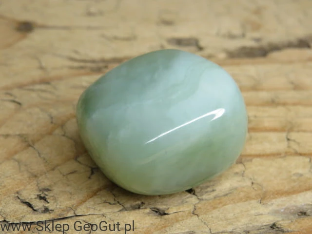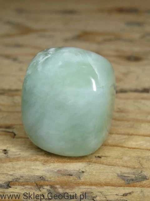 Jadeit wypolerowany (bębniak). Kamień posiada zagłębienia i spękania wynikające z jego struktury.