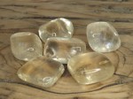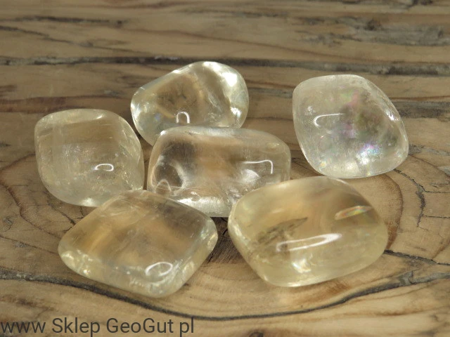 Kalcyt wypolerowany (bębniak). Kamienie posiadają wgłębienia i spękania wynikające z ich naturalnej struktury.