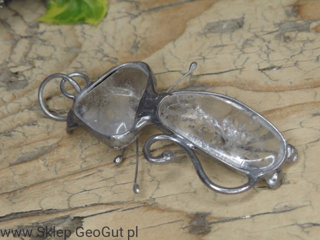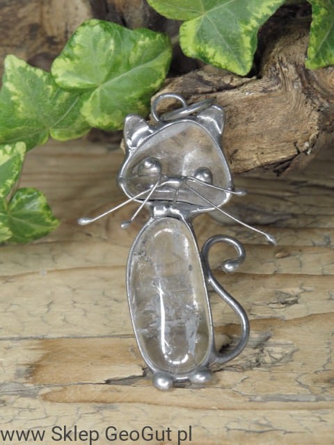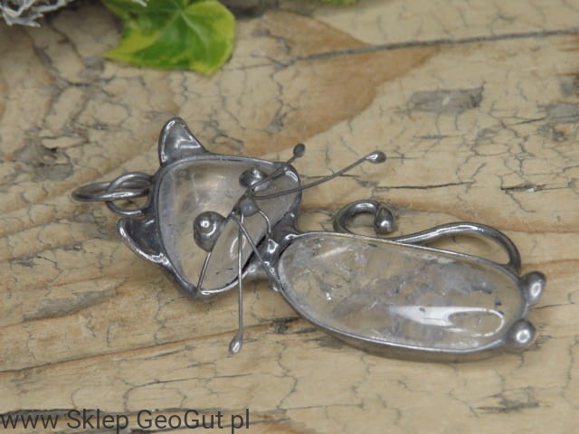 Wisior / zawieszka kotek z kryształu górskiego oprawionego w miedź i cynę (metaloplastyka).