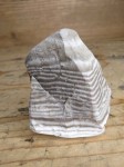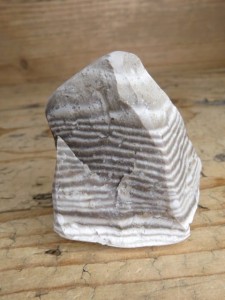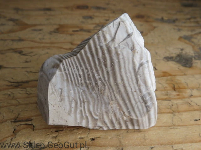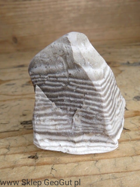 Naturalny okaz krzemienia pasiastego pochodzący z Polski, o wyraźnym i efektownym wzorze. Charakterystyczne ciemne i jasne pasma (warstwy) tworzą unikalny rysunek, dzięki któremu krzemień pasiasty jest jednym z najbardziej rozpoznawalnych kamieni ozdobnych naszego kraju.