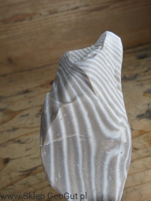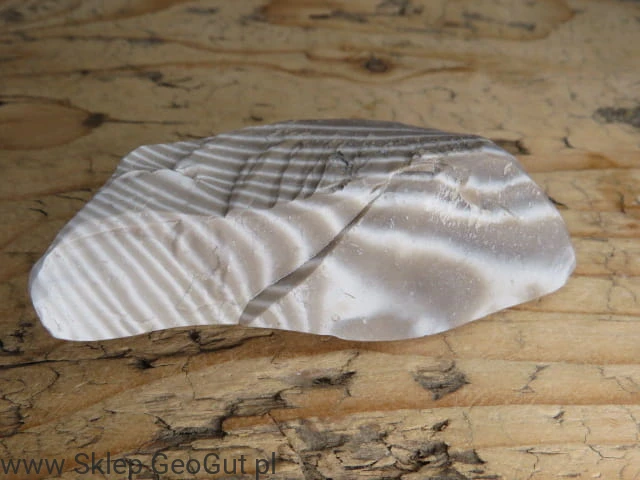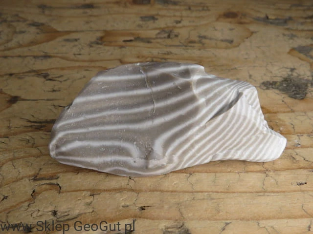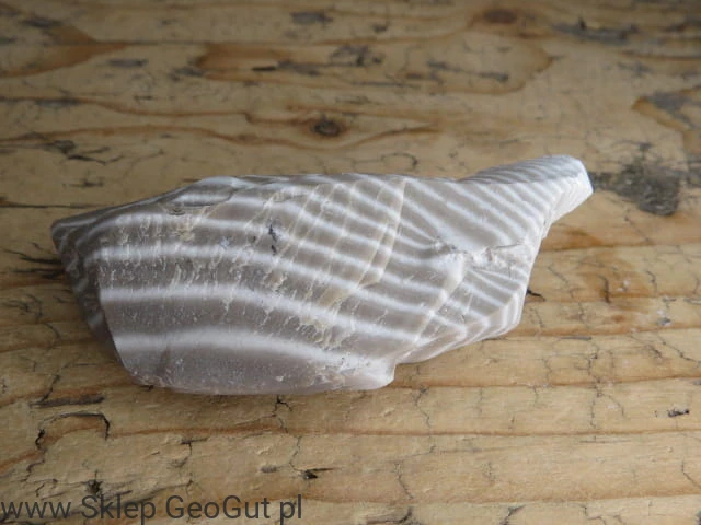 Naturalny okaz krzemienia pasiastego pochodzący z Polski, o wyraźnym i efektownym wzorze. Charakterystyczne ciemne i jasne pasma (warstwy) tworzą unikalny rysunek, dzięki któremu krzemień pasiasty jest jednym z najbardziej rozpoznawalnych kamieni ozdobnych naszego kraju.