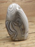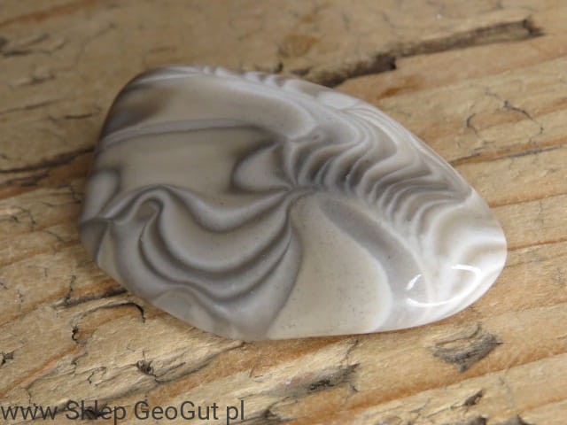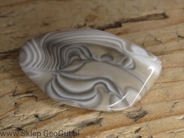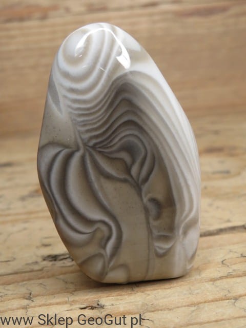 Polerowany okaz krzemienia pasiastego pochodzący z Polski, wyróżniający się wyraźnym, naturalnym wzorem. Charakterystyczne ciemne i jasne pasma (warstwy) tworzą harmonijny układ, który nadaje kamieniowi niepowtarzalny wygląd.