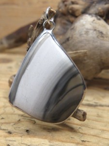 Elegancki wisior z naturalnego, szlifowanego krzemienia pasiastego o wyjątkowym, wyrazistym rysunku. Kamień o wymiarach 4,5 x 3,5 x 0,8 cm został oprawiony w miedź i cynę.