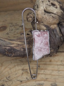 Okazała broszka w formie dużej agrafki, ozdobiona naturalnym, surowym kwarcem różowym oprawionym w miedź i cynę. Delikatny, różowy kamień o nieregularnej fakturze nadaje biżuterii unikatowego charakteru i subtelnego uroku.