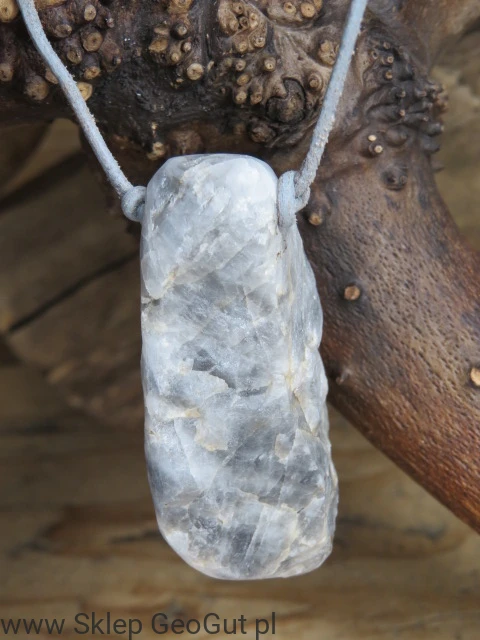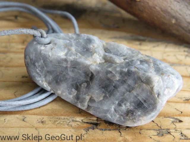 Ten wyjątkowy wisior wykonany jest z kwarcu srebrzystego pochodzącego z Gór Sowich. Kamień jest całkowicie surowy, przewiercony i uformowany w szlifierni GeoGut i zawieszony na szarym, skórzanym rzemieniu. Surowa forma minerału zachowuje jego naturalną strukturę i kształt, co sprawia, że egzemplarz jest unikatowy.