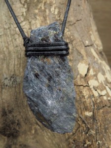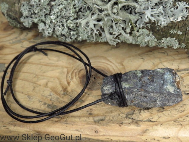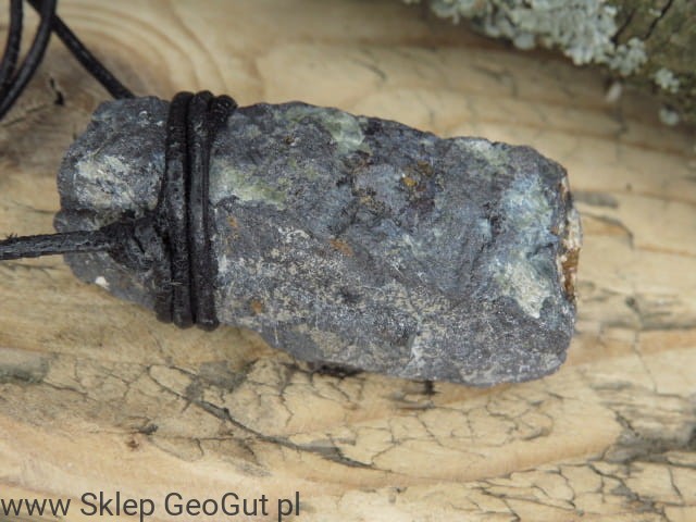 Kamień jest przewiercony, zawieszony na skórzanym rzemieniu.