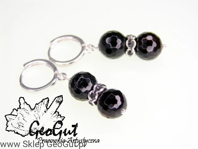 Kolczyki o długości 3,3cm z fasetowanego obsydianu o średnicy 0,7cm z czarnymi cyrkoniami na biglach typu "kajdanki".