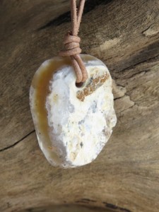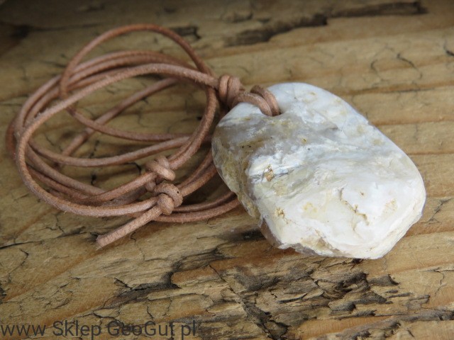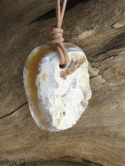 Kamień przewiercony, zawieszony na skórzanym rzemieniu w kolorze beżowym.