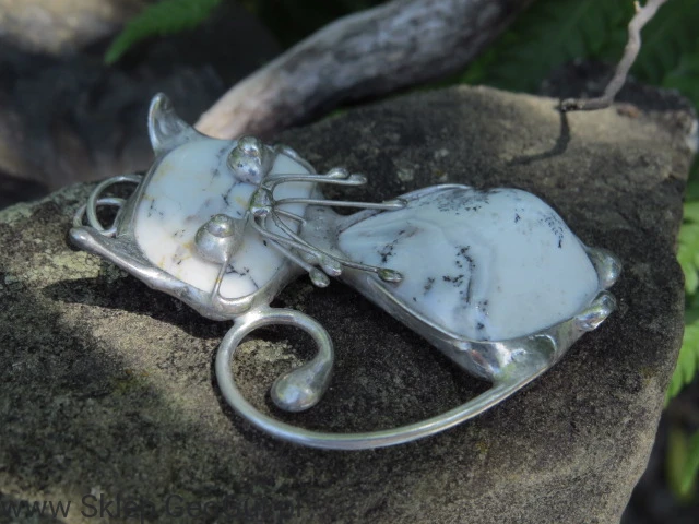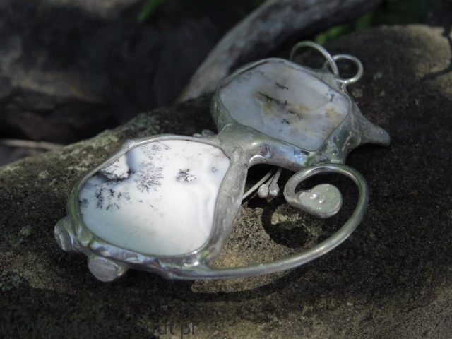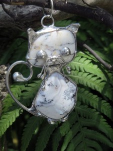 Wisior / zawieszka kotek z opalu mszystego oprawionego w miedź i cynę (metaloplastyka).