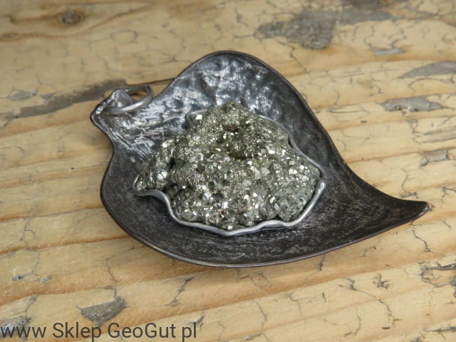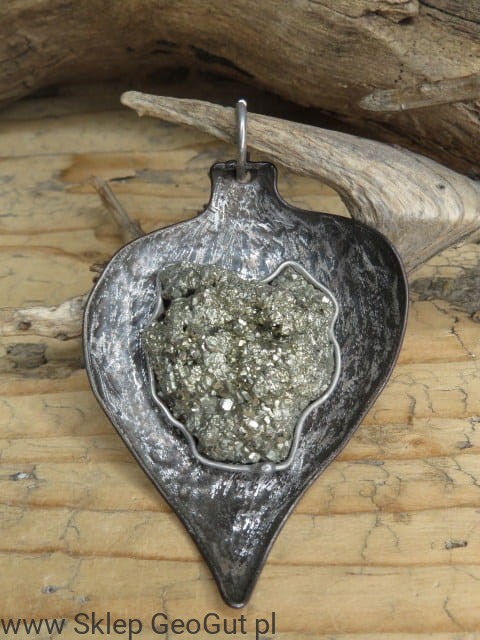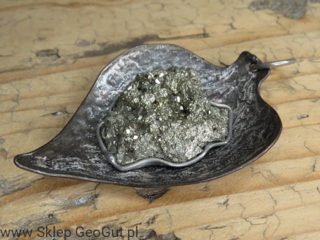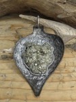 Wisior liść z pirytem oprawionym w miedź i cynę.