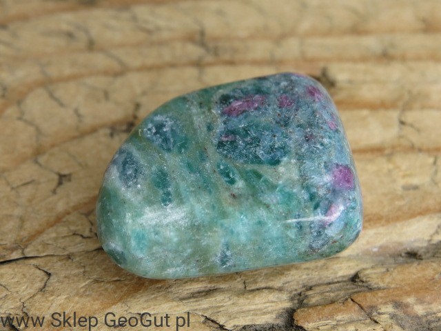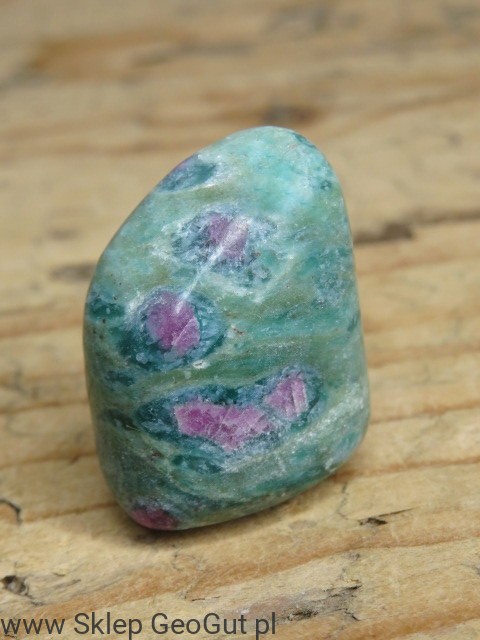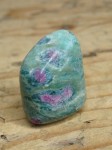 Okaz fuchsytu z rubinami. Kamień wypolerowany.