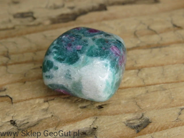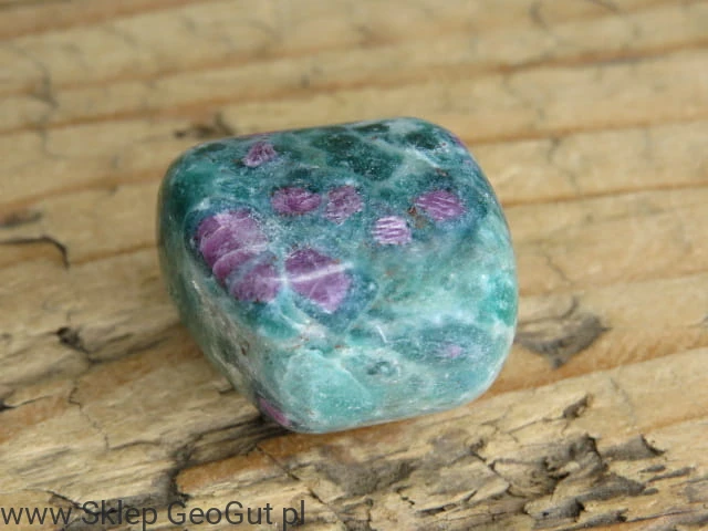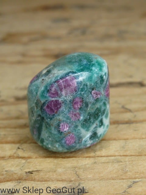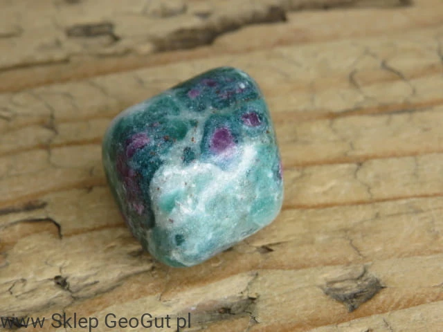 Okaz fuchsytu z rubinami. Kamień wypolerowany.