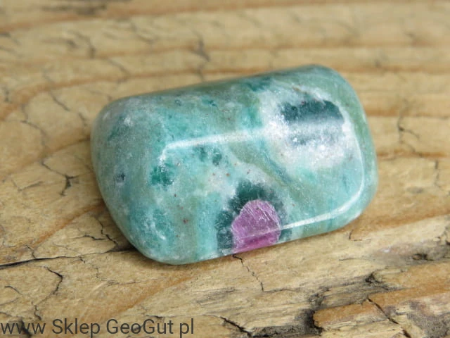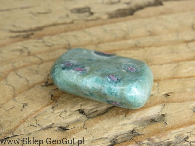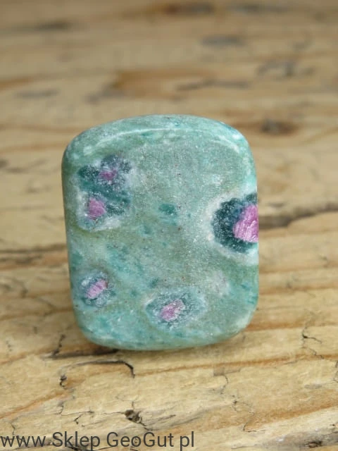 Okaz fuchsytu z rubinami. Kamień wypolerowany.