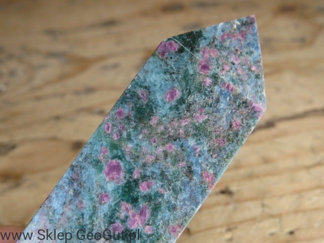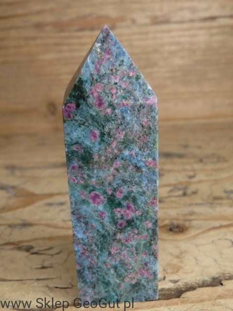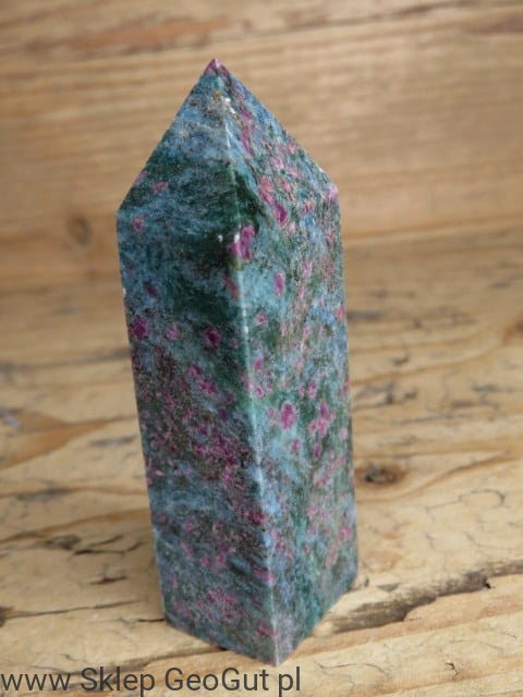 Obelisk z rubinów w cjanicie to niezwykle efektowny i rzadki okaz kolekcjonerski. Naturalne rubiny tworzą wyjątkowo bogate nagromadzenie w masie cjanitu, nadając całości niepowtarzalny charakter. W świetle UV rubiny intensywnie świecą, podkreślając ich naturalne właściwości i czyniąc obelisk spektakularnym elementem każdej kolekcji minerałów. Precyzyjnie szlifowana forma obelisku eksponuje strukturę kamienia, łącząc walory estetyczne z unikatową wartością mineralogiczną. Idealny dla kolekcjonerów, miłośników minerałów fluorescencyjnych oraz do celów dekoracyjnych i energetycznych.