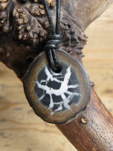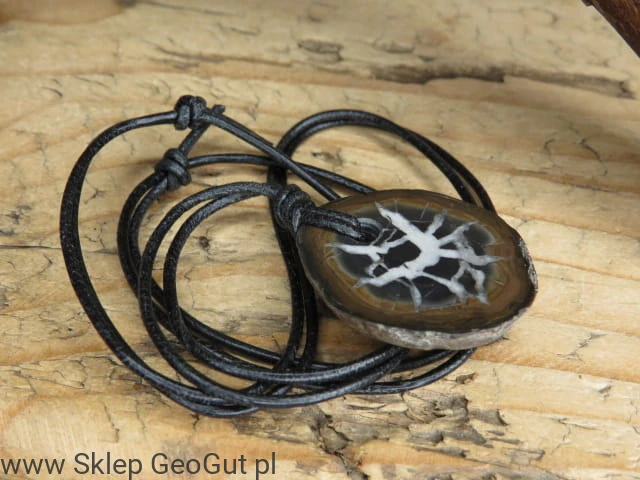 Piękny wisior z septarii jest przewiercony i zawieszony na czarnym rzemieniu. Długość rzemyka regulowana za pomocą przeciąganych supełków. Rozmiar kamienia to 3,1 cm x 2,8 cm x 0,7 cm.