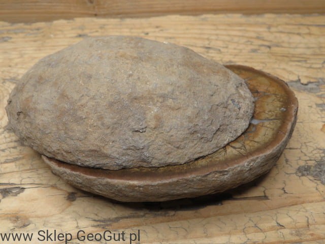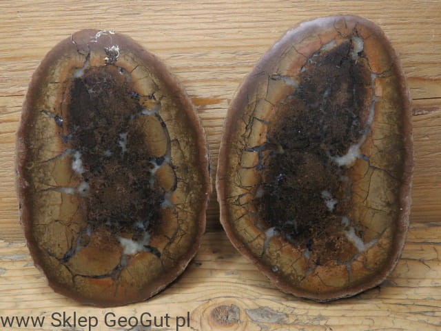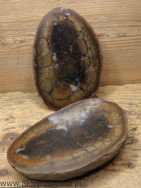 Septaria (sferosyderyt, syderyt ilasty) cała - przecięta na dwie połówki. Każda połówka wypolerowana.