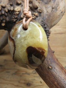 Wyjątkowy wisior z septarii to elegancki naszyjnik łączący naturalne piękno minerału z energetycznymi właściwościami ezoterycznymi. Kamień został przewiercony i zawieszony na beżowym, regulowanym rzemyku, co pozwala dopasować długość do indywidualnych potrzeb. Polerowany fragment septarii o wymiarach 4,3 cm x 3,3 cm x 2 cm pięknie eksponuje naturalną strukturę i wzory minerału. Kalcyt obecny w septarii wykazuje luminescencję UV, dzięki czemu kamień zachwyca w świetle ultrafioletowym.