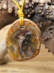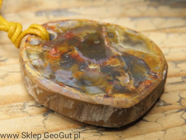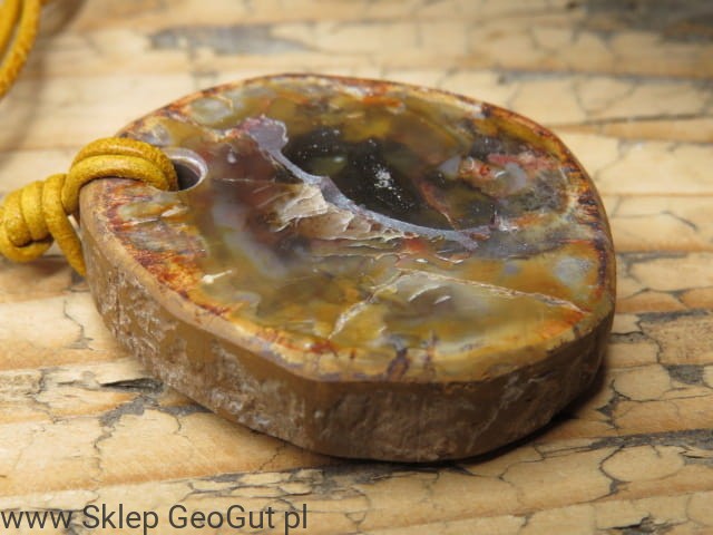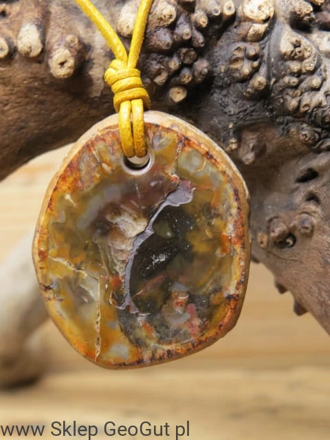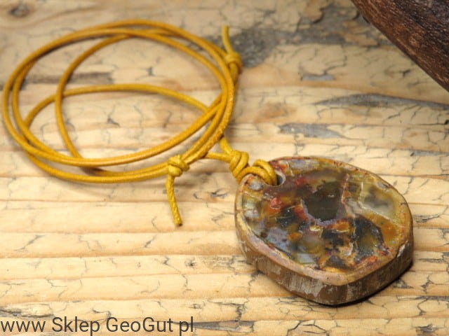 Kamień został starannie przewiercony i zawieszony na pomarańczowym, skórzanym rzemieniu, którego długość można regulować dzięki przeciąganym supełkom. Jego ciepła, ziemista kolorystyka podkreśla naturalne piękno skamieniałego drewna. Zdjęcia przedstawiają oferowany wisior.