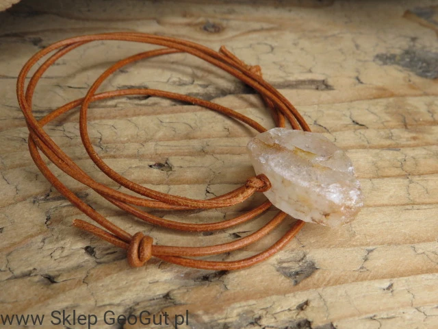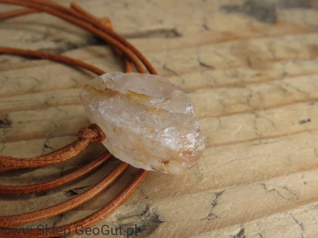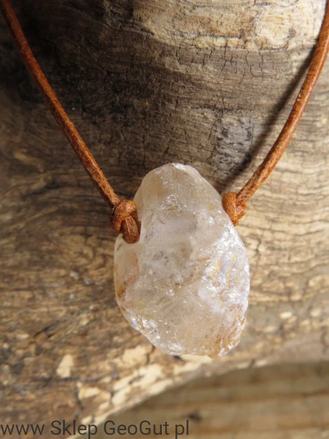 Kamień został przewiercony i zawieszony na skórzanym rzemieniu w kolorze brązowym, z możliwością regulacji długości, co zapewnia wygodę noszenia i uniwersalność.