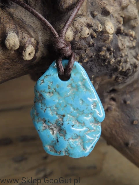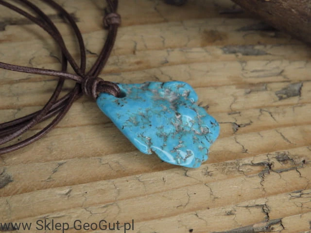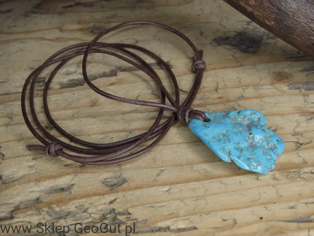 Naturalny turkus przewiercony i zawieszony na brązowym rzemieniu. Długość rzemyka regulowana za pomocą przeciąganych supełków.