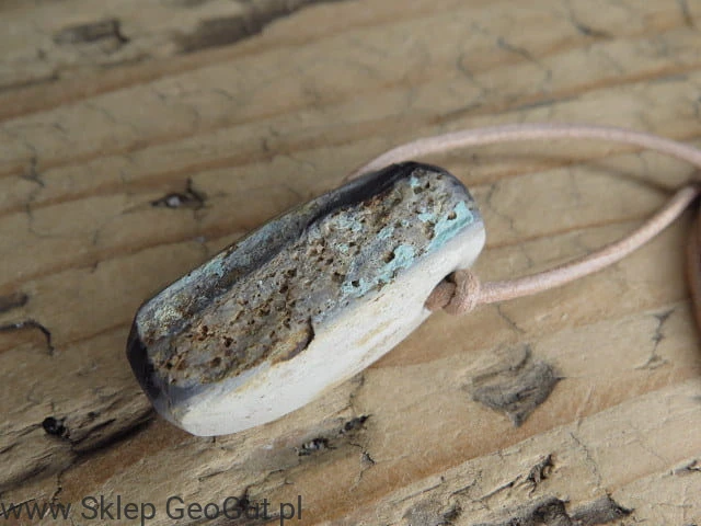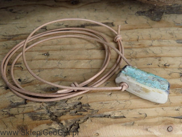 Wyjątkowy wisior z naturalnego turkusu pochodzącego z Polski to unikalny amulet, który łączy piękno natury z duchową mocą ochrony. Kamień w surowej formie o wymiarach 3,3 x 1,4 x 1,2 cm jest przewiercony i zawieszony na skórzanym rzemieniu w kolorze beżowym, z regulowaną długością dzięki przeciąganym supełkom.