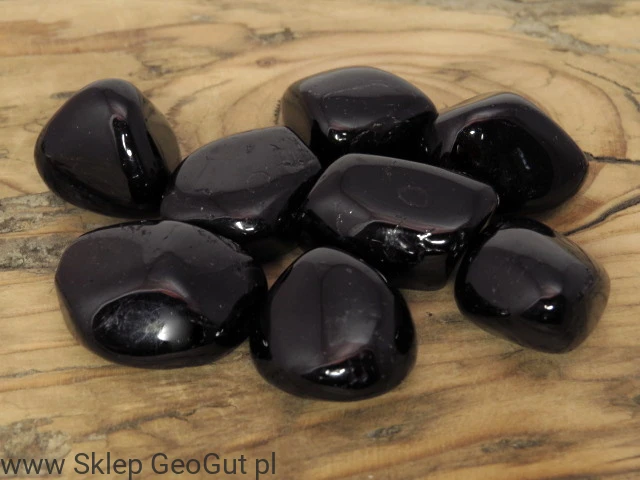 Czarny turmalin (szerl, schörl)- wypolerowany bębniak. Kamienie posiadają liczne spękania wynikające ze struktury kamienia.