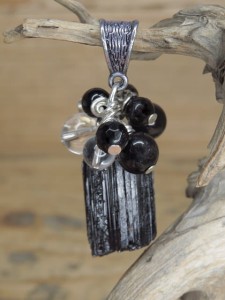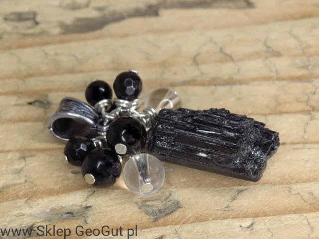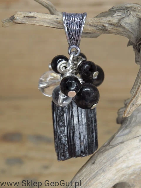 Wisiorek z surowego czarnego turmalinu (szerl) oraz ze szlifowanego turmalinu i kryształu górskiego.