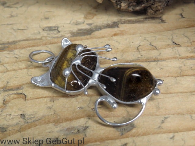 Ręcznie wykonany wisior w kształcie kotka z naturalnego tygrysiego oka – kamienia znanego ze swojego hipnotyzującego połysku i głębokich, złoto-brązowych barw. Oprawa z miedzi i cyny, wykonana techniką metaloplastyki, nadaje zawieszce niepowtarzalny, rzemieślniczy charakter.