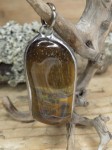Wisior z tygrysiego oka oprawionego w miedź i cynę.
