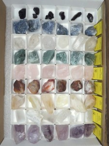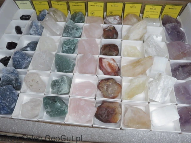 Zestaw 54 sztuk minerałów: turmalin, kwarc błękitny, karneol, ametyst, awenturyn, cytryn, selenit, awenturyn, kryształ górski, kwarc różowy. Wielkość kamieni: około 3-4cm